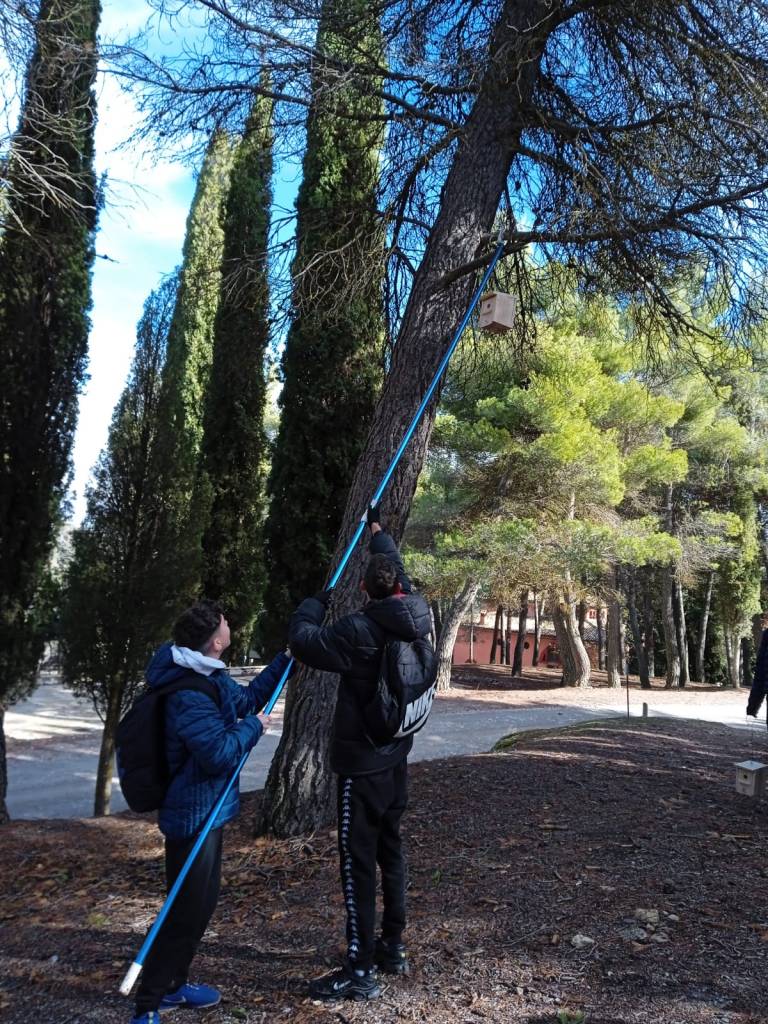 La segunda sesión fue como “el partido de vuelta”, si la primera sesión era llevar la sierra al instituto ahora llevamos al alumnado al parque natural. La idea fue similar conocer primero mejor nuestro espacio protegido, mediante una visita al Centro de Visitantes y un sendero guiado. Después unas acciones pro-ambientales como son en este caso la construcción y colocación de cajas nido y la plantación de más de un centenar de plantas de una amplia diversidad de especies. Las cajas nido favorecerán la biodiversidad de la fauna y además como están diseñadas para aves insectívoras favorecerán el control de las plagas forestales. Las plantas aumentarán la diversidad de un pinar de reforestación haciéndolo más resistente a los problemas ambientales.