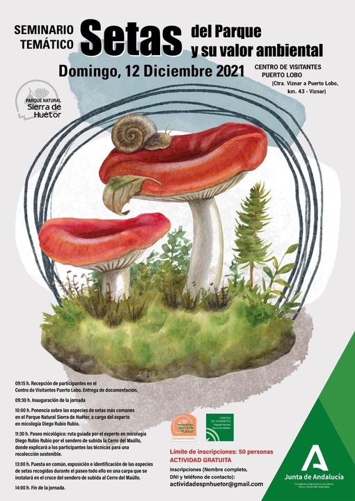 Uno de los paraísos micológicos de Granada es espacio natural, por eso desde el Parque Natural Sierra de Huétor organizan, para el día 12 de diciembre, una jornada temática en el Centro de Visitantes Puerto Lobo (y alrededores). Se abordará no solo la diversidad de estos seres vivos en esta sierra si no también su importancia y valor ambiental. Incluye charla, paseo, exposición, etc. Os dejamos más abajo el cartel de la convocatoria por si alguien se anima a desvelar los secretos de las setas.