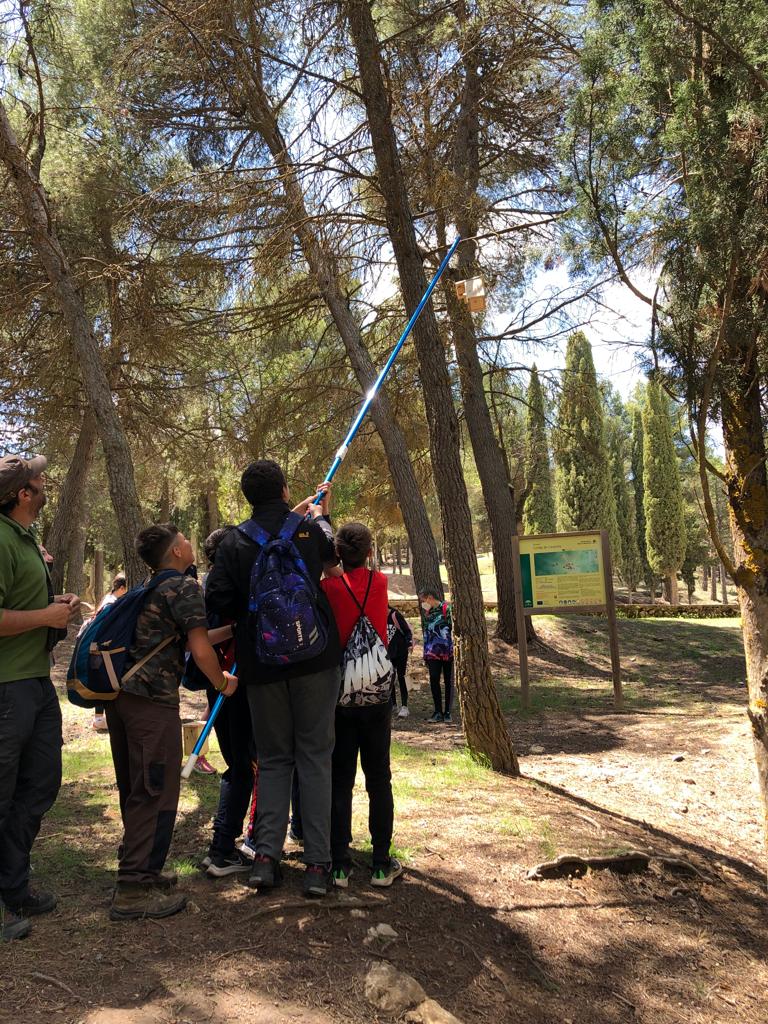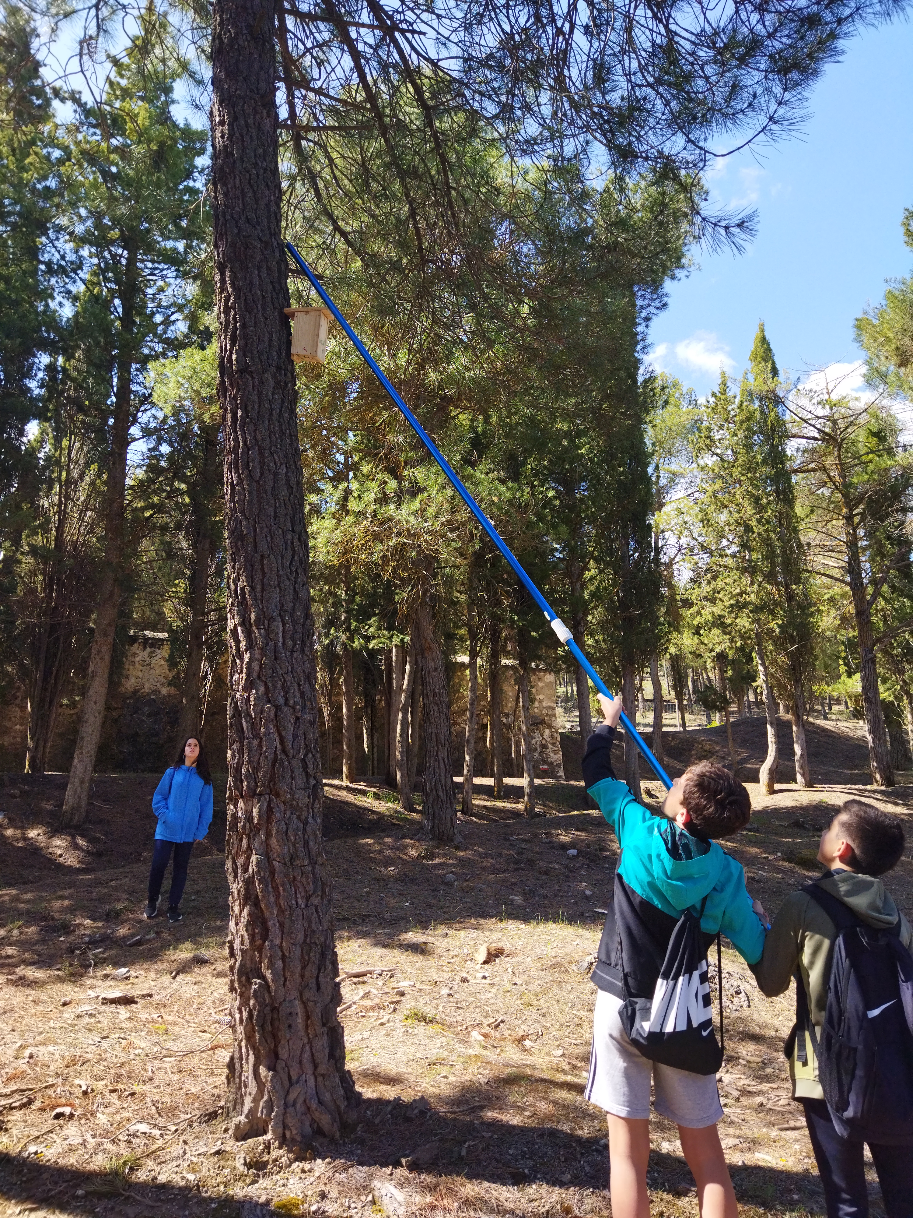 A los pocos días de esta intervención, el Instituto disfrutó de una visita al entorno de Narváez, donde se encuentra el Centro de Visitantes, así como senderos en los que nos apoyamos para lograr nuestros objetivos. La meta era ver in-situ parte de lo que tratamos en el aula, replicando la metodología que hicimos en el centro educativo. Primero, una visita guiada por el entorno para interpretar el patrimonio natural, cultural e histórico, así como acercar algunos de los problemas y soluciones que presenta. Si en el aula intentamos lograrlo mediante el juego, en el medio nos propusimos que el buen ambiente y disfrute del contacto directo con el entorno fuera lo más importante. En esta ocasión, también quisimos que la participación ambiental ocupara parte de la mañana. Facilitamos que estos jóvenes pudieran ser protagonistas de la solución de algunos de los problemas de su sierra. Para lograr ese fin, se lanzaron las Bombas de Semillas (creadas por ellos) y se montaron y colocaron 8 cajas nido (del modelo Cajas de Diversidad).