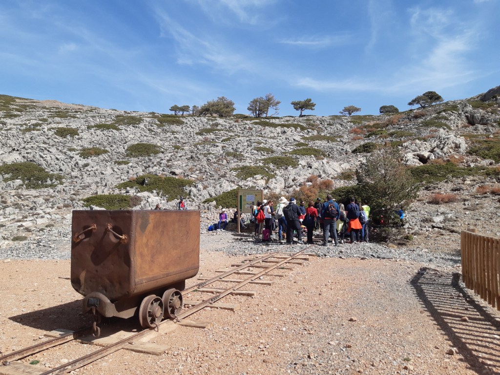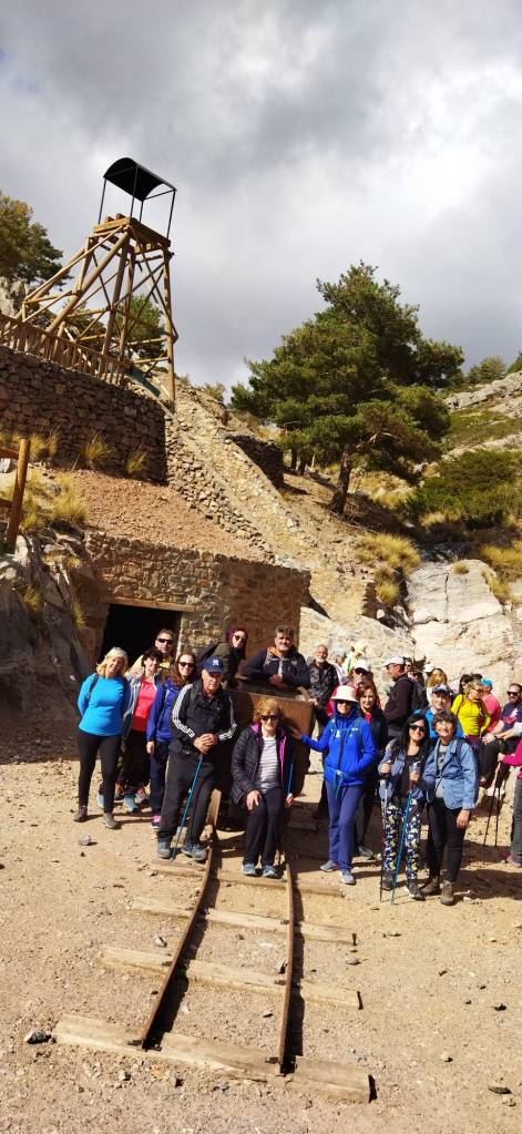 Nuestro paseo nos llevó a visitar las restauradas Minas del Carmen y Minas de la Cruz, ejemplos más significativos de la minería de esta zona de calares, aunque las bocaminas, escombreras y huellas del pasado minero se encuentran dispersas por todo el lugar. Visitamos las restauradas zonas de cargaderos, tolvas de carga, bocaminas con sus raíles y vagonetas, castilletes, etc. Y en estos entornos contemplamos algunos de los ejemplares minerales que tanto sudor y agotamiento produjeron, galena, pirita, fluorita, etc. descubriendo algunos de los usos que de los mismos se ha hecho a lo largo de la historia.