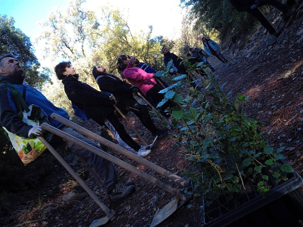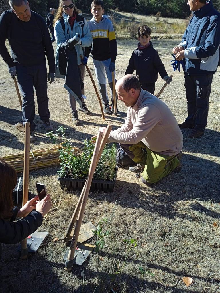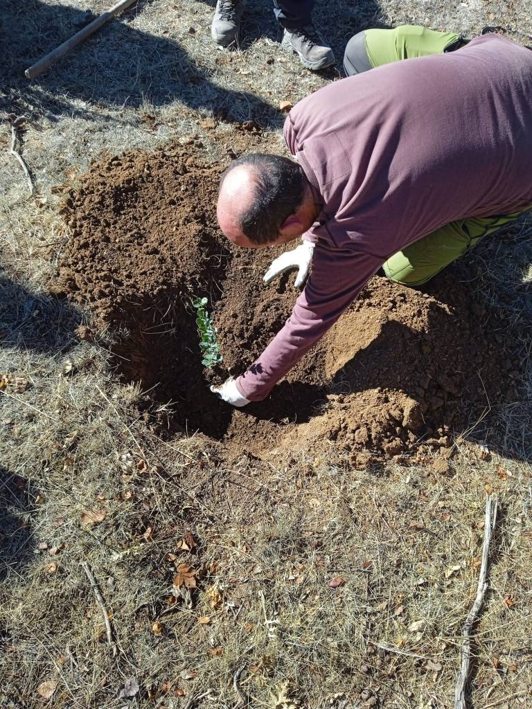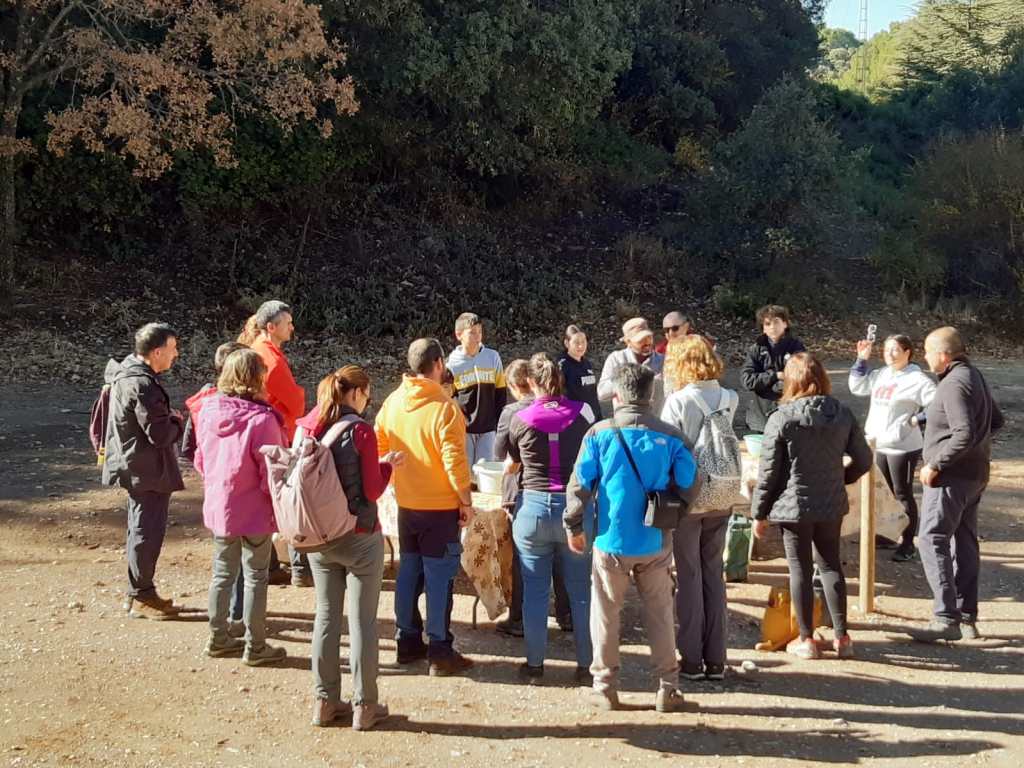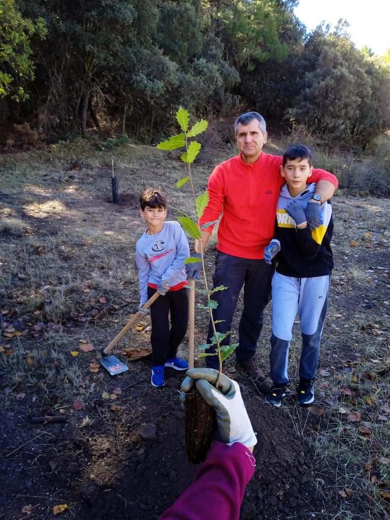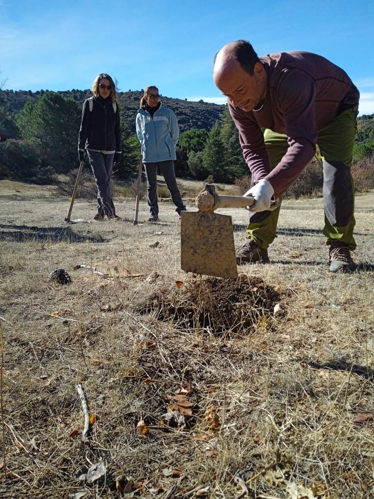 Ojo, que no todo fue dura reflexión que era domingo por la mañana, por favor, también dedicamos nuestro tiempo a poner nuestro gratino de arena para diversificar la masa forestal, para lo que realizamos una pequeña plantación de encinas, quejigos, rosales, majuelos, plantas aromáticas, etc. Un suelo algo reblandecido tras las últimas lluvias nos permitió un buen trabajo, una oportunidad para que muchos de los participantes, plantasen su primer ejemplar. Esperemos que los primeros de muchos por llegar.