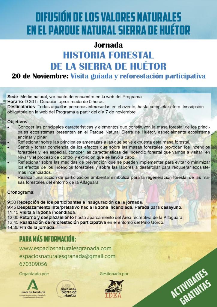 10:00 Recepción de los participantes e inauguración de la jornada con presentación general del Programa “Difusión de los valores naturales en el Parque Natural Sierra de Huétor” y de las Jornadas “Historia Forestal de la Sierra de Huétor”.